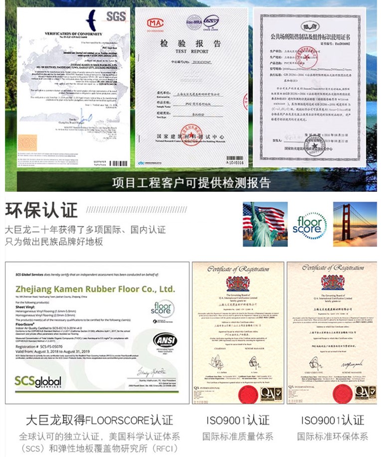 大巨龍NO.8塑膠地板規格參數:20m×2m×2.0mm 耐磨層:0.35mm 重量:2900克/平米 防火等級B1